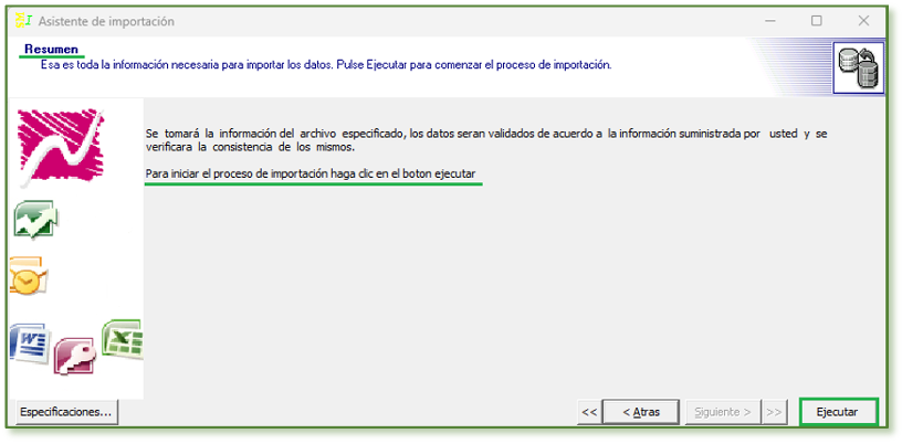 Paso 8: El programa genera un mensaje resumen de los datos a importar. Seguido el usuario activa la opción “Ejecutar”.