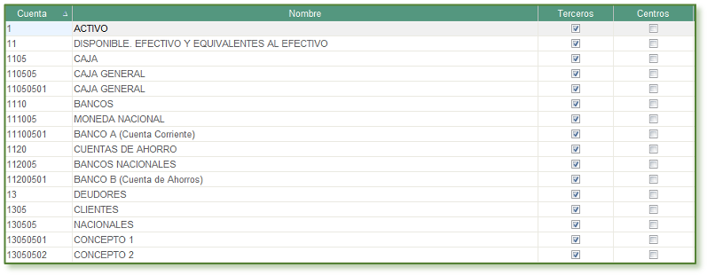 | Código Cuenta | Nombre Cuenta | Marca Terceros | Marca Centros de Costos |