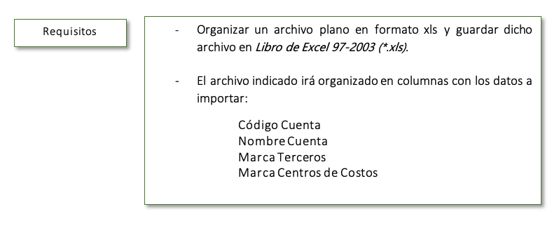 | Código Cuenta | Nombre Cuenta | Marca Terceros | Marca Centros de Costos |