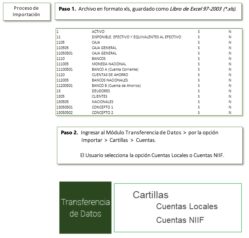A continuación, ejemplo del archivo en Excel para importar Cartilla de Cuentas Contables.
